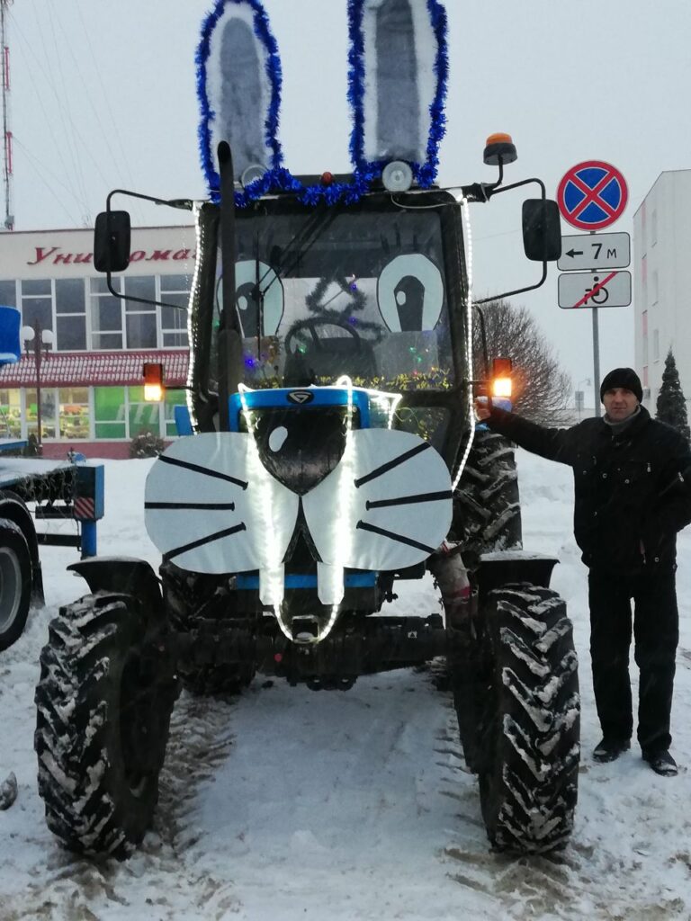 Вечером 16 декабря в городе Мосты прошла церемония торжественного зажжения огней на главной ёлке. Коллектив КСУП «Имени Адама Мицкевича» креативно и творчески подошли к оформлению трактора- участника автопробега. Сварщики сделали уши, слесари – зажимы. Внутрь поставили инвертор, к которому подключили гирлянды.